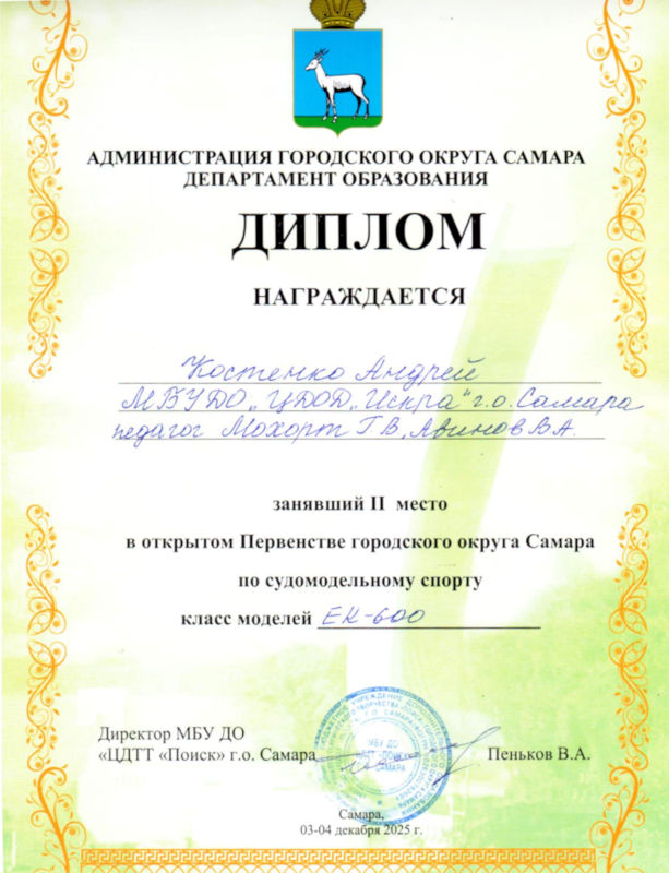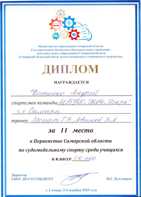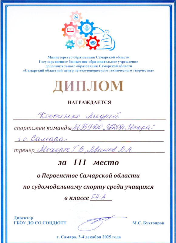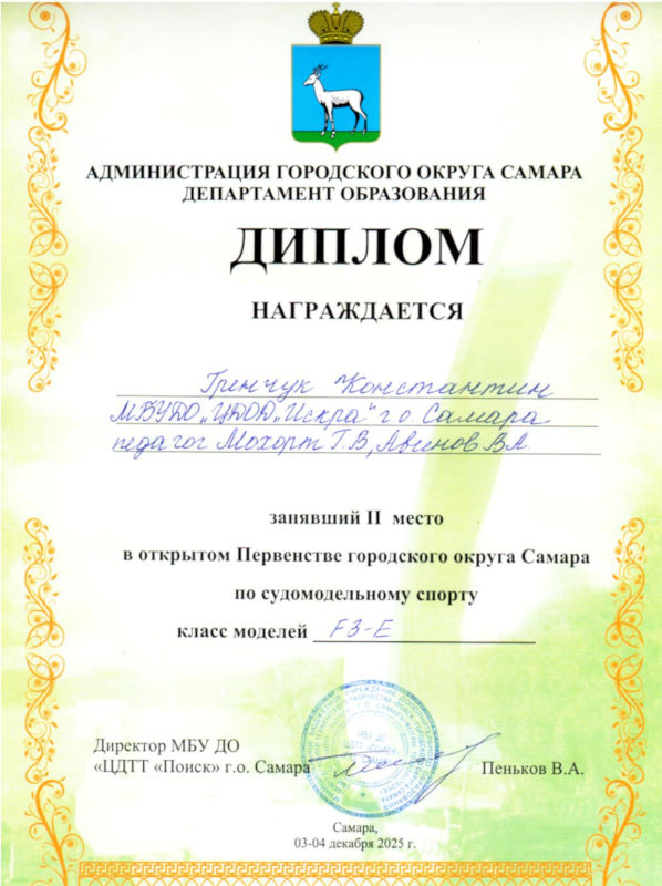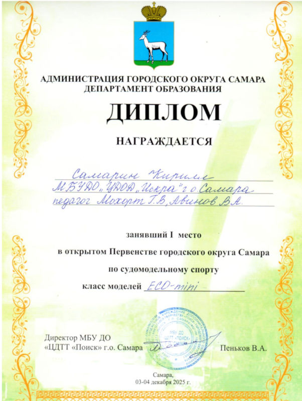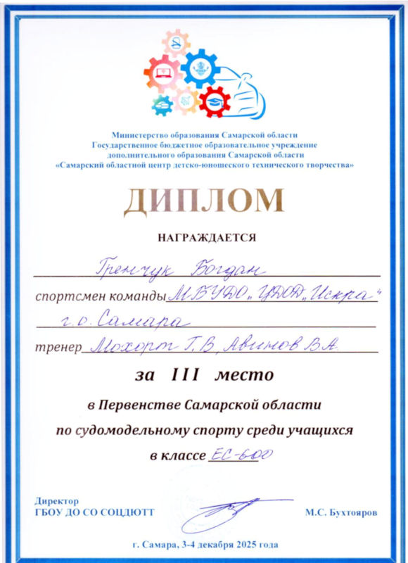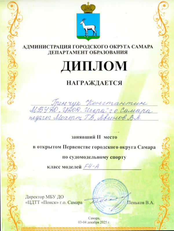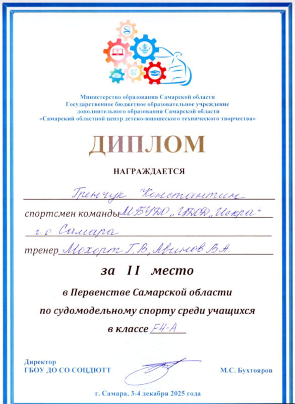 15.05 и 19.05 2025 г состоялось Первенство Самарской области по судомодельному спорту среди учащихся. В Первенстве приняли участие Самарин Кирилл, Козлов Михаил, Гренчук Константин, Костенко Андрей и Хаустов Дмитрий. Каждый из воспитанников выступил достойно, заняв призовые места.