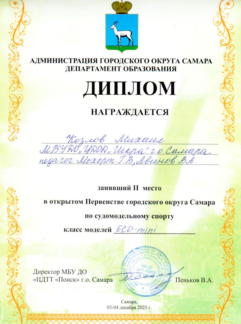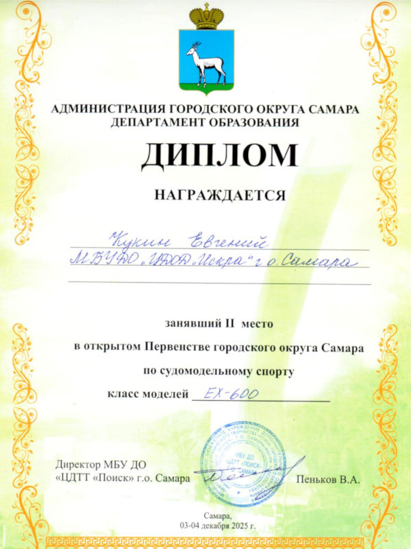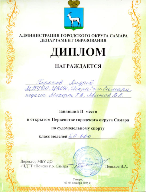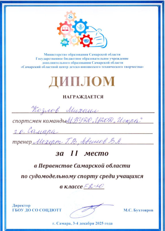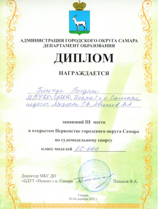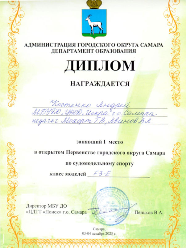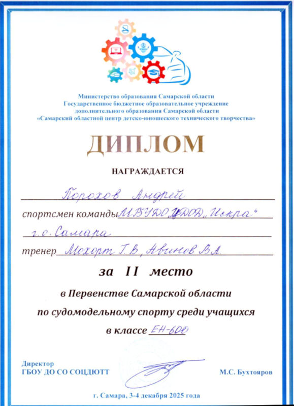 15.05 и 19.05 2025 г состоялось Первенство Самарской области по судомодельному спорту среди учащихся. В Первенстве приняли участие Самарин Кирилл, Козлов Михаил, Гренчук Константин, Костенко Андрей и Хаустов Дмитрий. Каждый из воспитанников выступил достойно, заняв призовые места.