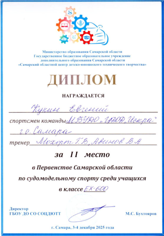 | • Самарина Кирилла, Усманова Михаила, Рыбакова Андрея, Неменова Егора, занявших призовые места в Первенстве Самарской области по судомодельному спорту среди учащихся