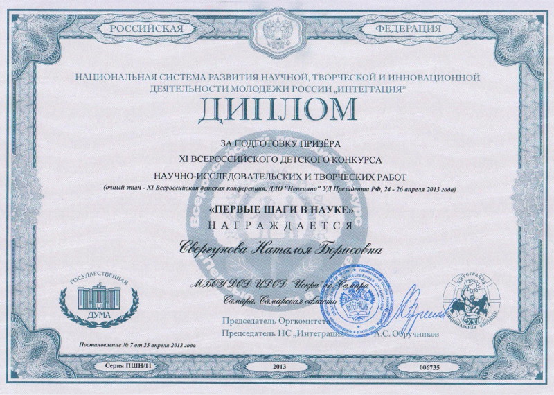 Арнольд Дмитрий (педагог-организатор Свергунова Н.Б. – подростковый клуб «Ритм») принял участие в XI Всероссийском детском конкурсе научно-исследовательских и творческих работ, который прошел в Москве, и привез в Самару Диплом II-степени.