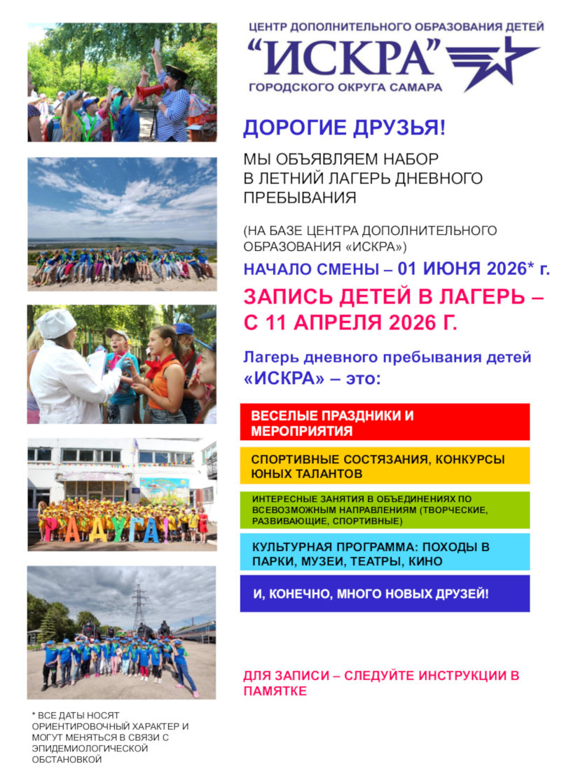 Уважаемые родители! Запись в лагерь дневного пребывания переносится на 14 апреля 2025 года. Вся информация будет размещена на сайте. Администрация МБУ ДО ЦДОД "Искра" г.о.Самара